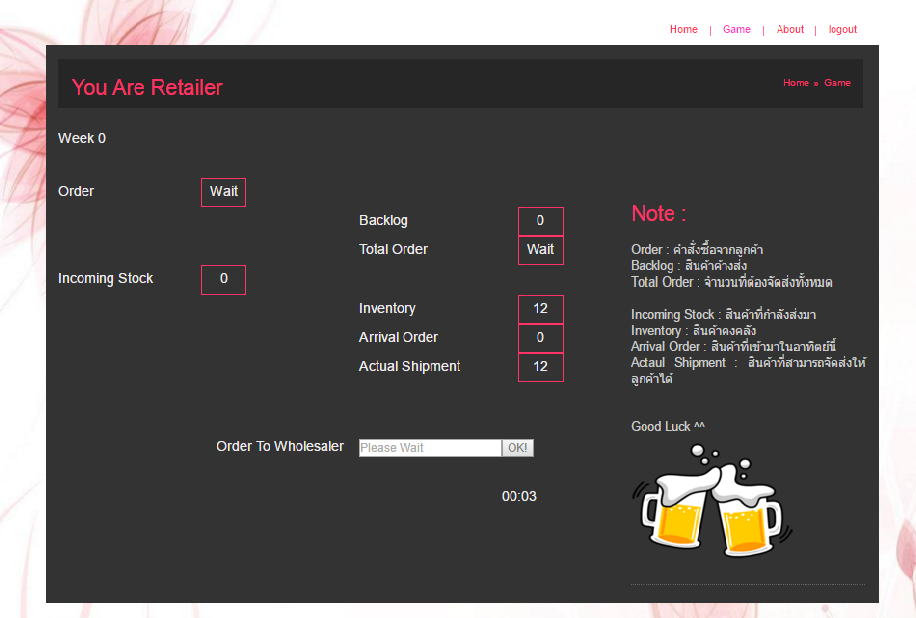 7. จากหน้าจอของเกม เมื่อมีคำสั่งซื้อจากลูกค้ามา ตำแหน่ง Order จะขึ้นจำนวนที่ลูกค้าต้องการสั่งซื้อและหากท่านมีสินค้าค้างส่งของสัปดาห์ที่แล้ว(Backlog)